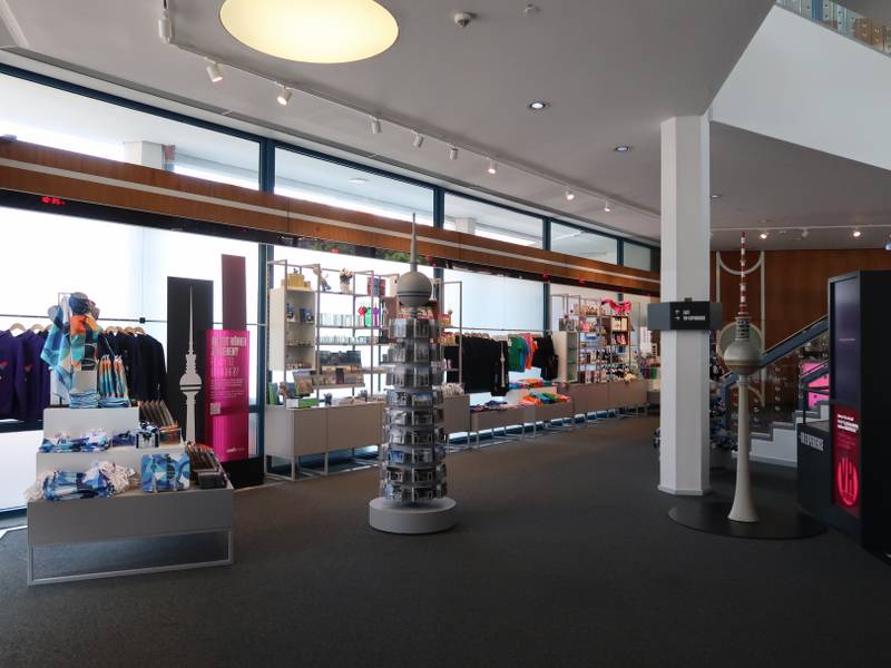 The souvenir shop is located at the base of the tower and is accessible to all visitors, including those without a ticket to go up. The shop offers a high-quality range of gifts that extend beyond standard tourist trinkets, featuring exclusive Berlin and tower-themed merchandise.